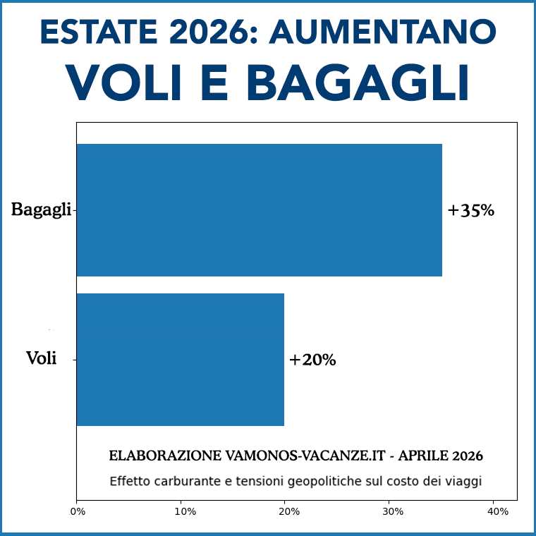 L’estate 2026 si preannuncia più costosa per chi viaggia. Non solo per i biglietti aerei, ma anche per i servizi accessori come i bagagli, sempre più spesso soggetti a rincari. «A pesare è soprattutto l’aumento del costo del carburante, legato alle tensioni geopolitiche in Medio Oriente, che sta già spingendo le compagnie aeree a rivedere i listini» spiegano gli analisti di Vamonos Vacanze, tour operator specializzato in vacanze di gruppo.