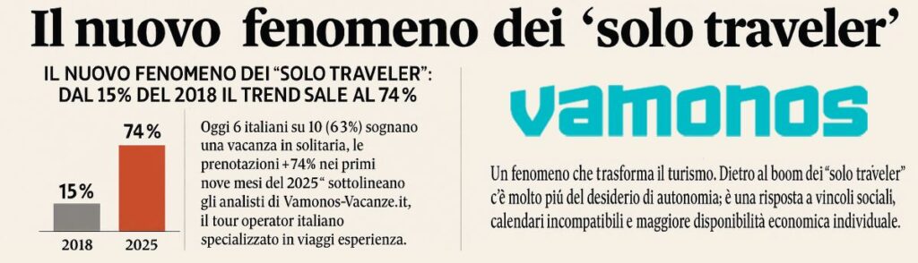 «Oggi 6 italiani su 10 (63%) sognano una vacanza in solitaria, le prenotazioni +74% nei primi nove mesi del 2025» sottolineano i responsabili della piattaforma Vamonos-Vacanze.it, il tour operator italiano specializzato in viaggi esperienza.